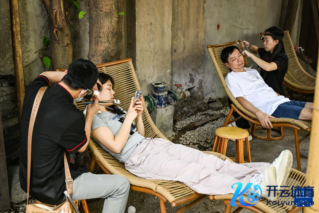6月8日,旅客在重庆市渝中区山城巷体验采耳办事。
