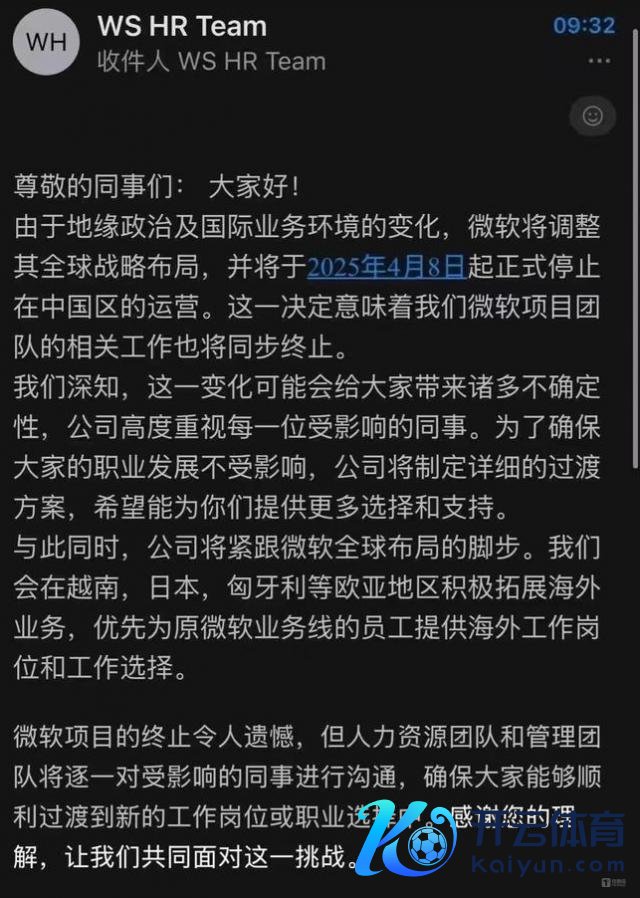 4 月 7 日早间,微软寰球科技的外包业务供应商(vendor)之一、微软旗下合股公司的微创软件向部分职工发出邮件称,由于地缘政事及国际业务环境的变化,微软将退换其寰球战术布局,并将于 2025 年 4 月 8 日起负责罢手在中国区的运营,"这一决定意味着咱们微软方法团队的干系责任也将同步拒绝"。