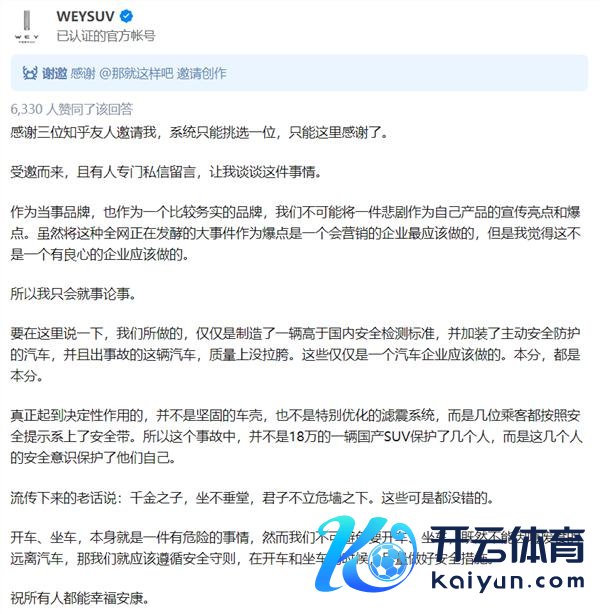 长城汽车董事长魏建军转发上述微博称:"万幸东说念主没事,岂论何时齐要珍摄安全出行,严慎驾驶。尽头感谢您,遭受事故,还在领导每一位车主齐平祥瑞安出行,安安全全回家。"