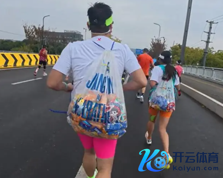 11月17日,苏州吴中举行马拉松比赛,一男一女两名畅通员疑似薅免费补给,将“能量胶”打包背在后背“负重”奔走。