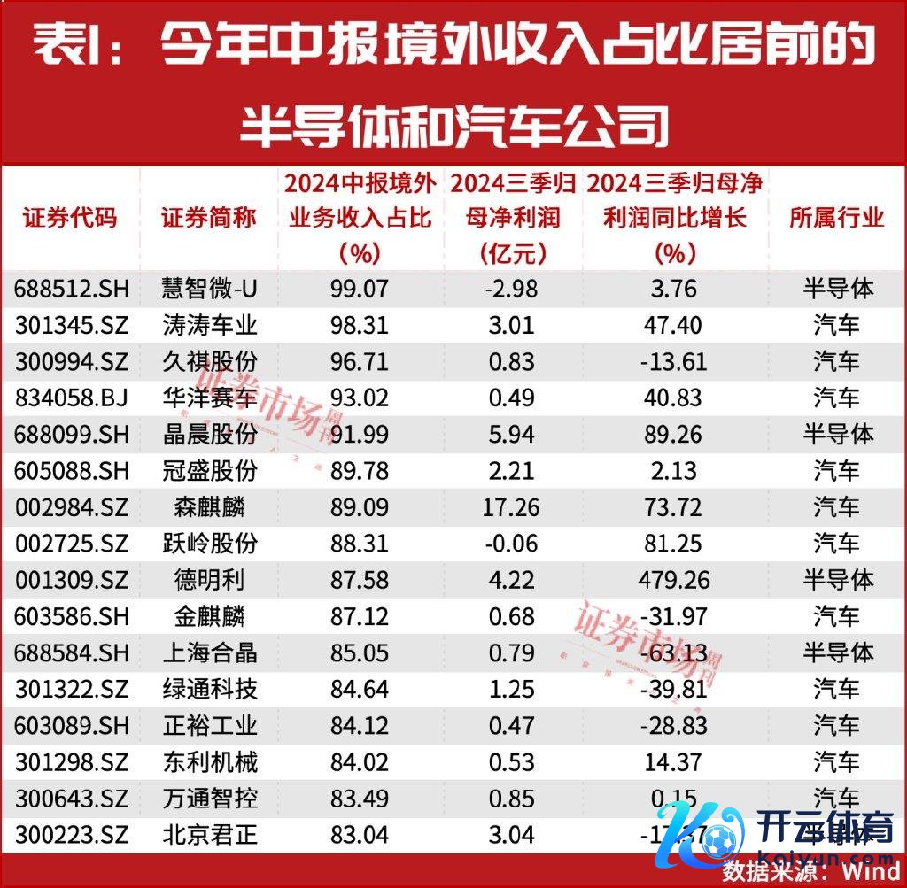 笼统而言,在半导体和汽车行业中共有16只个股的境外业务收入占比拟高,均在80%以上。 其中涛涛车业、华洋赛车、晶晨股份、森麒麟和跃岭股份等多只个股本年前三季度不仅罢了了盈利,且盈利增长均在40%以上(见表1)。