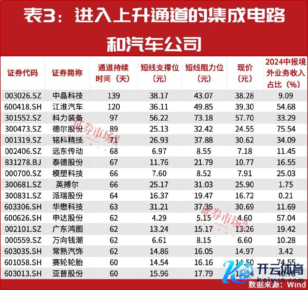 此外,多只集成电路和汽车赛说念的个股在上升通说念捏续时代更长,其中中晶科技捏续时代最长为139天,江淮科技次之为120天(见表3)。