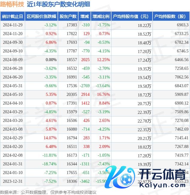 从股价来看,2024年9月30日至2024年11月29日,路畅科技区间跌幅为3.12%,在此时刻鼓舞户数减少310.0户,减幅为1.75%。