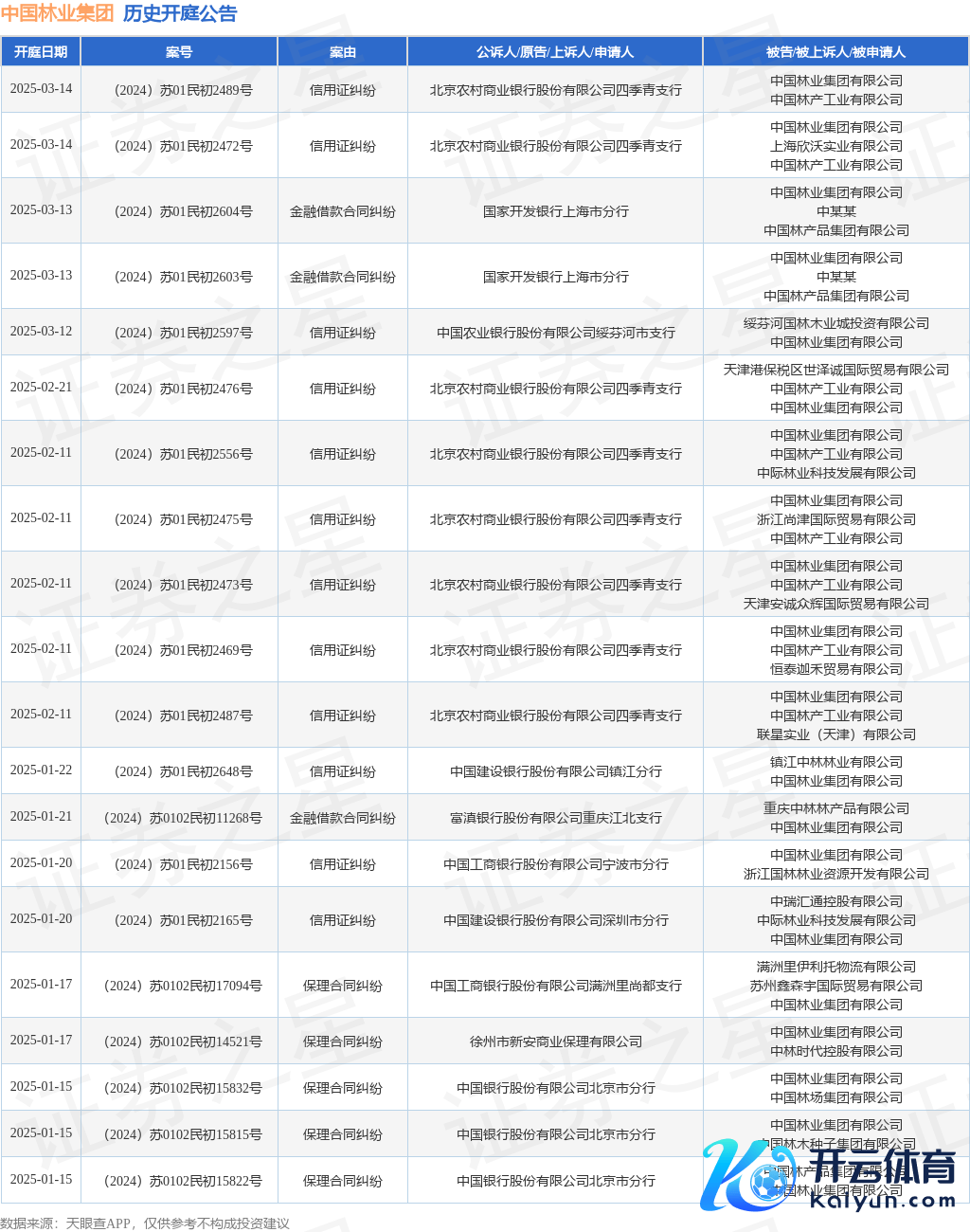 案号:(2024)苏01民初1716号审理法院:江苏省南京市中级东谈主民法院案由:信用证纠纷当事东谈主信息: 原告/上诉东谈主:中国配置银行股份有限公司上海嘉定支行 被告/被上诉东谈主:中国林业集团有限公司、中国林家具集团有限公司、上海胜持胜林业有限公司开庭日历:2025年1月7日字据统计,近一年内以中国林业集团有限公司为当事东谈主的历史开庭公告有257则,其中案由为“金融借款协议纠纷”的公告以96则居首,其次为“信用证纠纷”有51则,“保理协议纠纷”有29则。历史开庭公告(前20条)如下: