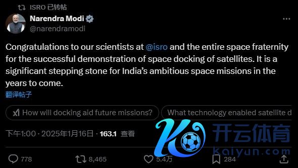 印度总理莫迪在X平台发文暗示道喜。他写谈:“道喜ISRO的科学家和系数这个词航天界得手演示卫星对接。这是印度将来几年利欲熏心的天外任务的垂危基石。”