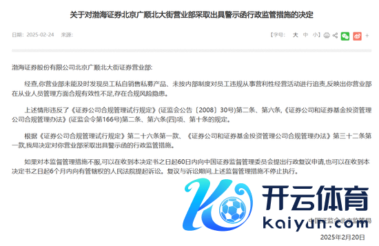 下发于本年2月20日的监管函涌现,渤海证券北京广顺北大街营业部(简称:广顺北大街营业部)未能实时发现职工暗里销售私募居品,未按里面轨制对职工违规从事谋利性地方行动进行追责。