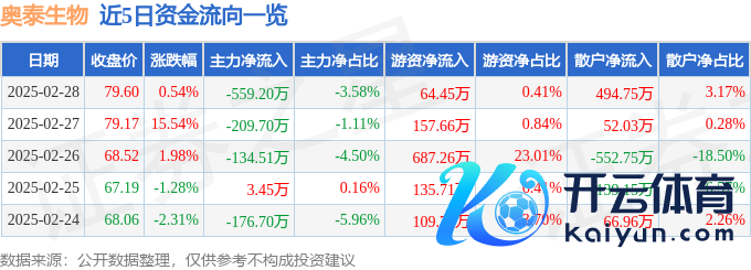 本站音尘,为止2025年2月28日收盘,奥泰生物(688606)报收于79.6元,高潮0.54%,换手率2.48%,成交量1.96万手体育游戏app平台,成交额1.56亿元。