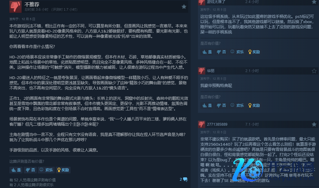 但也有玩家指出,本作莫得了HD-2D像素作风引以为傲的构图与光影,是手游级别的品性以及手游的作风;也有玩家衔恨豪华版特典的缺失,这在本年新游戏的首发情况中已是百鸟争鸣的风物,同期也有手柄适配很差劲的情况。