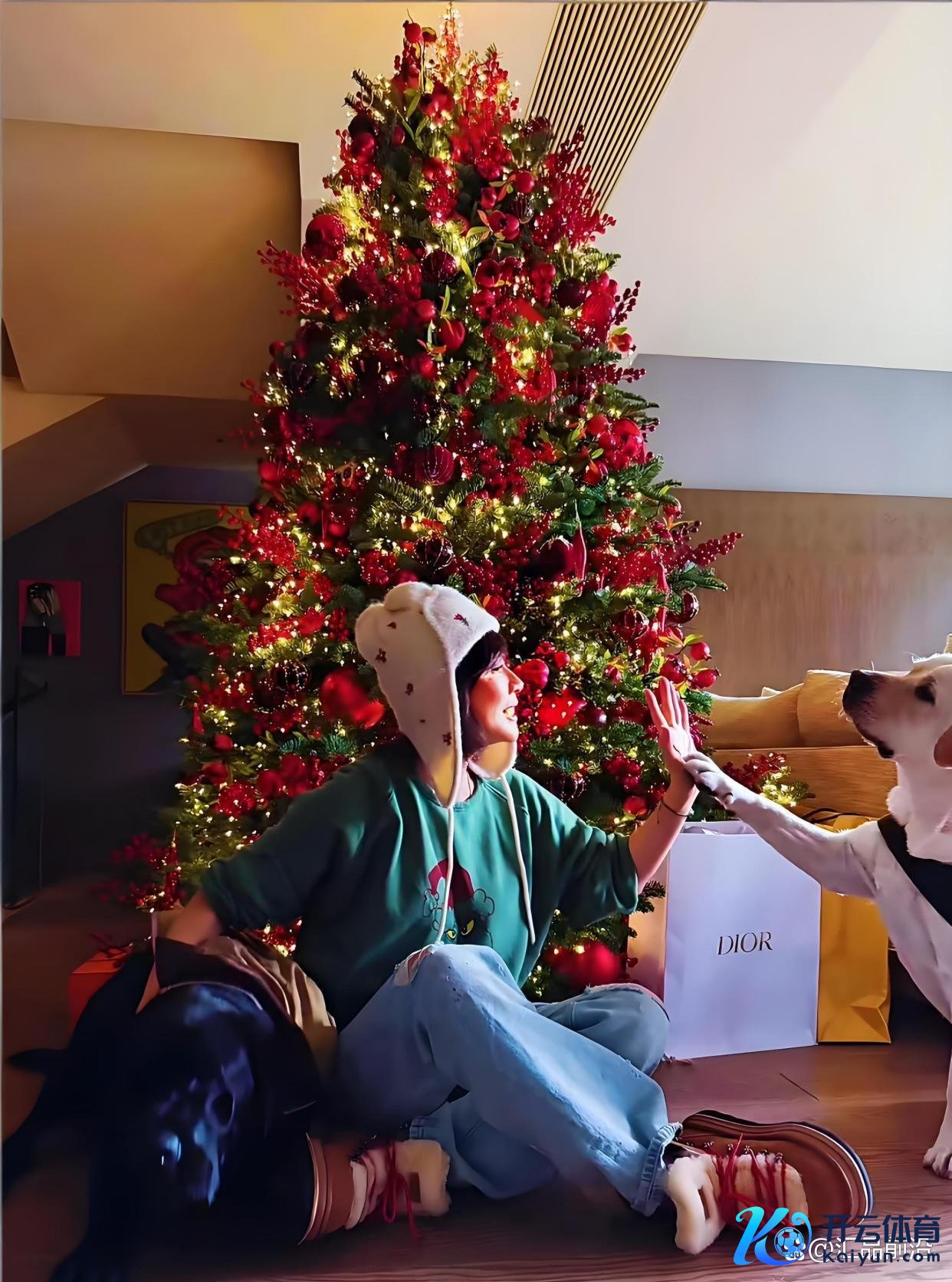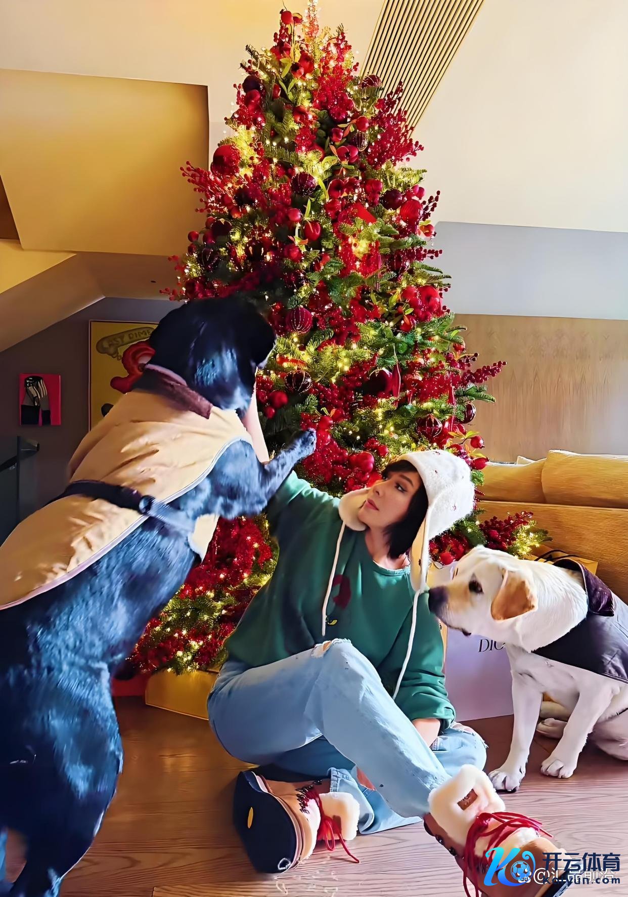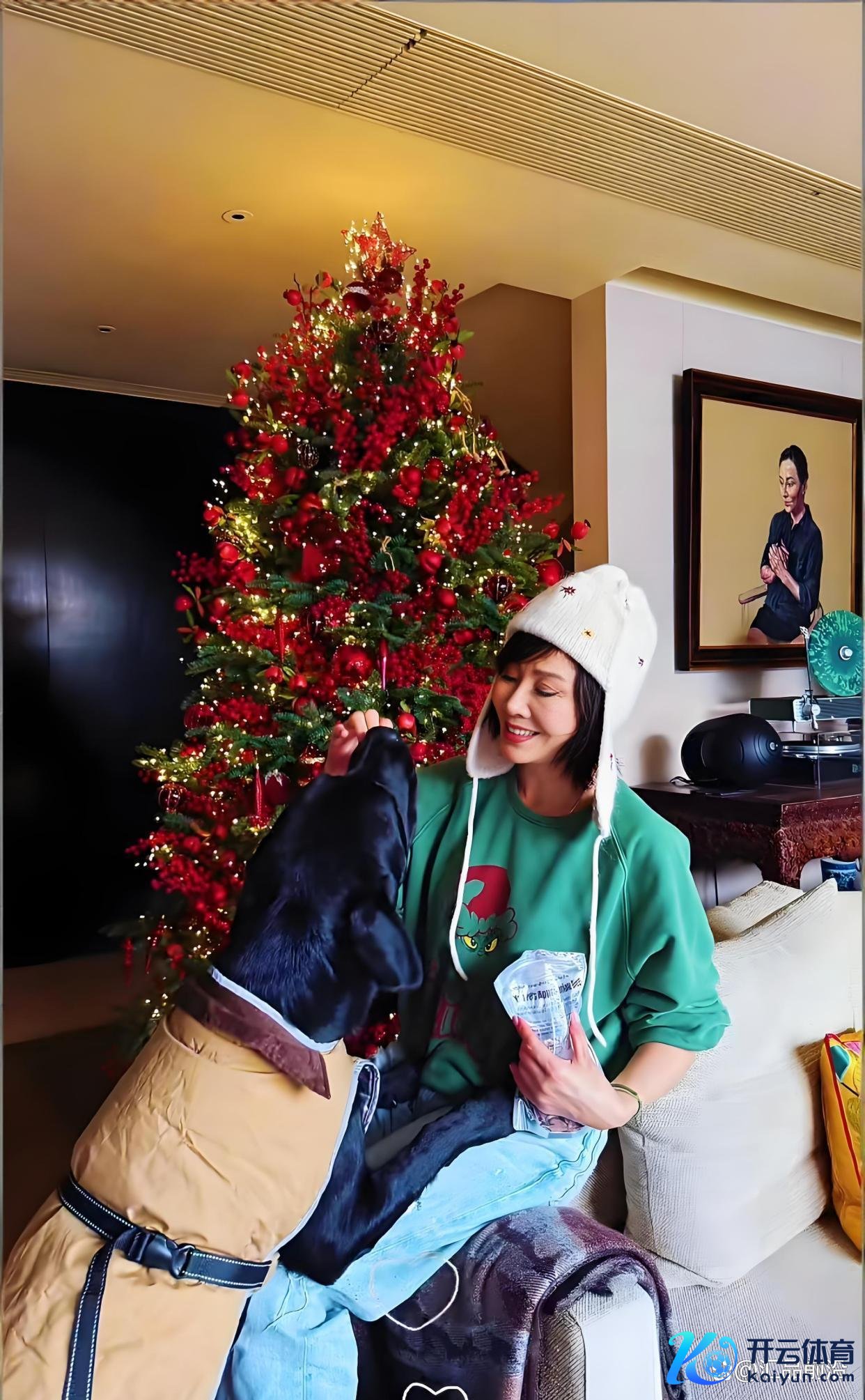 像片径直放出来,东说念主就站在客厅里,身边一棵圣诞树,脚边两只狗。画面浅易,以致有点家常。