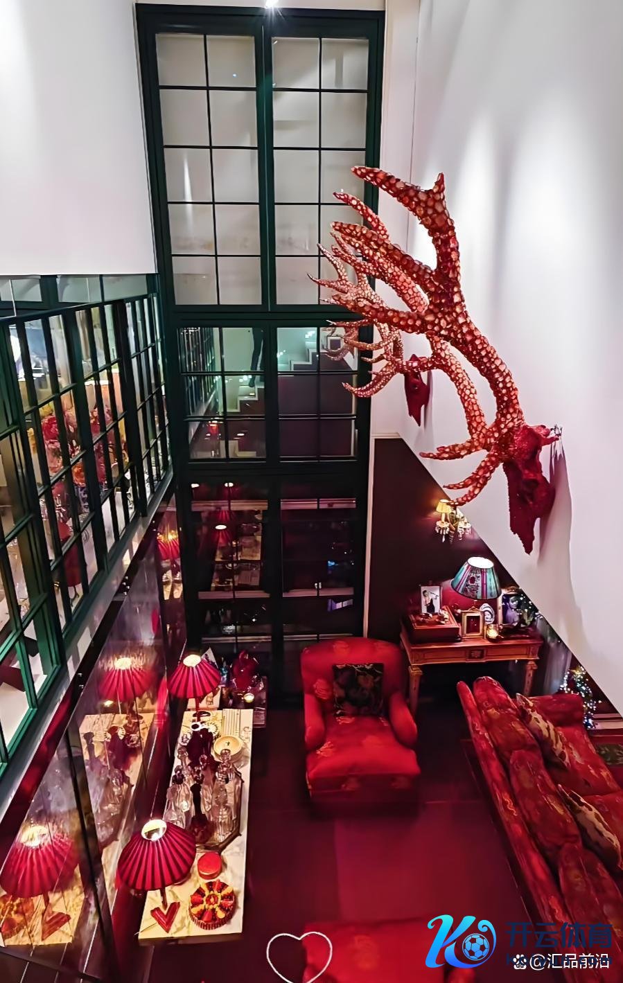 白色的壁龛里伸出一双雄壮的鹿角,上头镶满了红支柱。