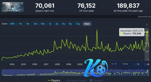昨年 12 月时,WF 发布了年度资料片《旧日和平》,在 Steam 上的玩家同期在线峰值直冲历史第二岑岭。