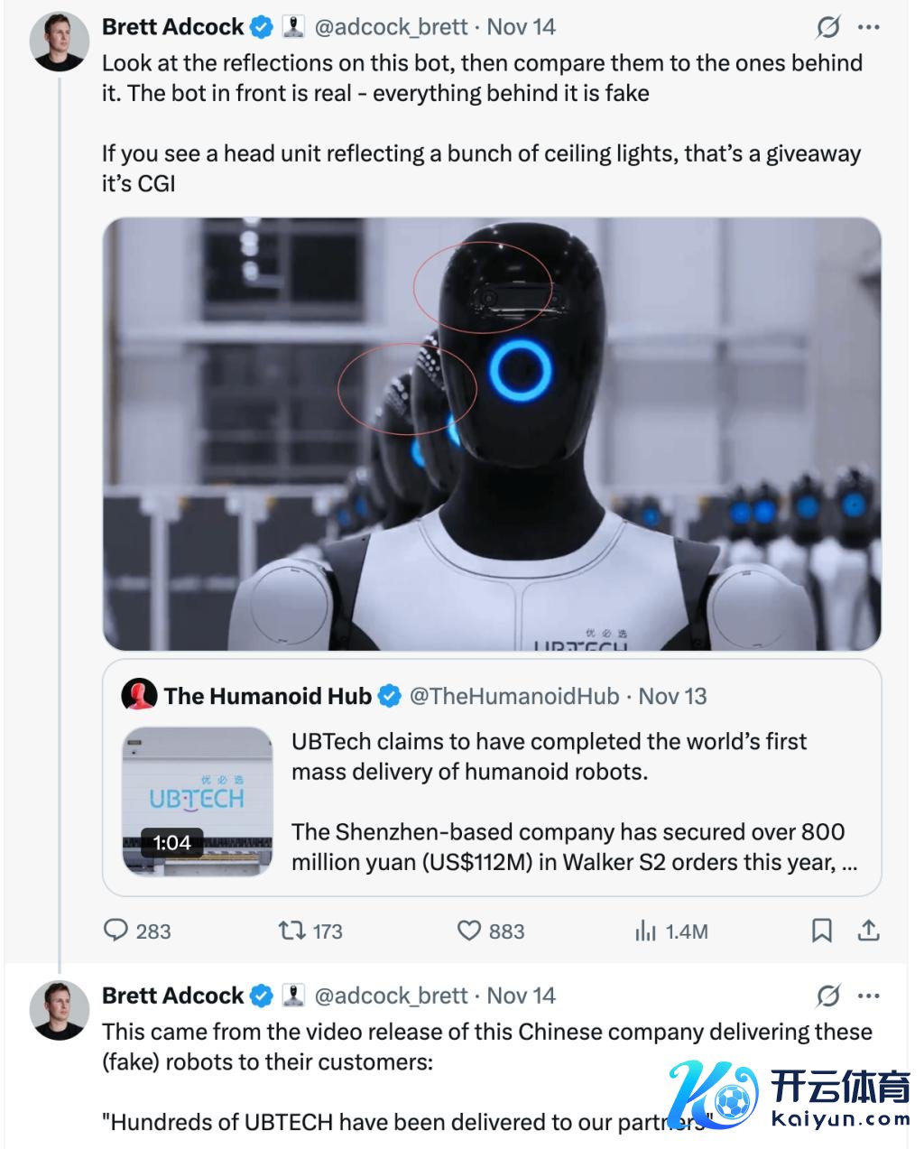 优必选暗示开云体育(中国)官方网站,这次视频发布为优必选已毕数百台全尺寸工业东谈主形机器东谈主Walker S2隆重请托的里程碑,皆备是现场真的拍摄。优必选官方账号已针对此作假说法发布了一镜到底、原速原声的视频素材,体现了现场的真的情况。