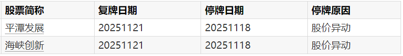 Wind数据露出,11月21日,平潭发展、海峡转变复牌。