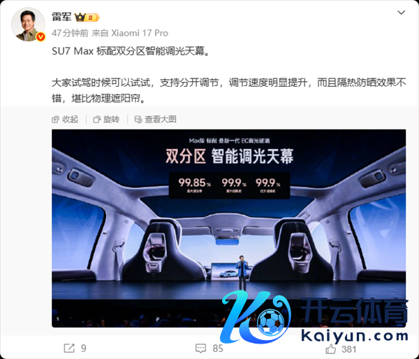 快科技3月24日音信,雷军在酬酢平台官宣,新一代小米SU7 Max标配双分区智能调光天幕,接收最新一代EC调光玻璃,调光速率更快体育游戏app平台,隔热防晒后果可以,堪比物理遮阳帘。