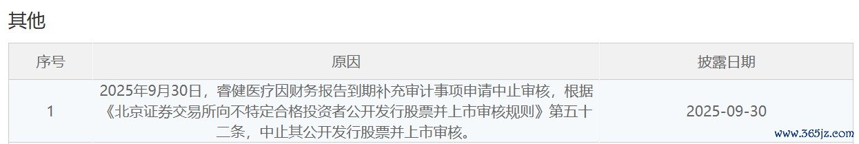 此外,9月30日,睿健医疗因财务解说到期补充审计事项央求中止审核,北交所凭证猜度法例中止其公开刊行股票并上市审核,睿健医疗最新IPO进程露出为“中止”。